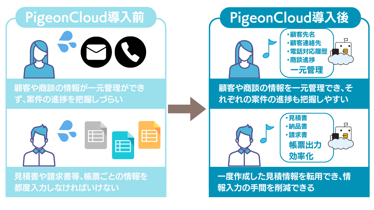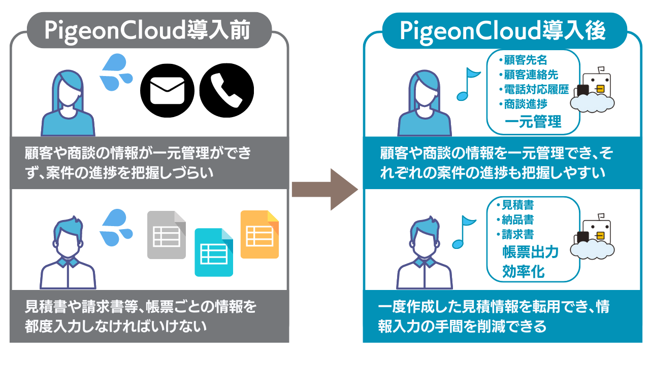 PigeonCloudなら、これまでバラバラに使っていたシートを都度、Excelで作成する必要はありません。受注から請求までのフローの中で、一度登録したデータを有効活用しながら、リアルタイムに状況を共有することができます。