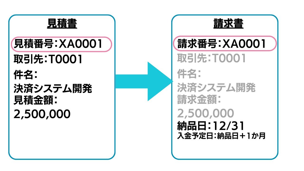 納品書送付後、無事にプロジェクトの検収を受領したら、今度は先方に請求書を送付します。この場合も、ゼロからデータを作成する必要はありません。最終的な売上計上時や請求書作成時に、最終見積の情報を呼び出して、入力を効率化することが可能です。 例えば下図の例ですと、見積番号をキーとする想定で、請求管理テーブルで見積番号を入力すれば、その見積番号に紐づく見積情報を見積管理アプリで参照し、自動で項目をセットする、といったことも可能です。