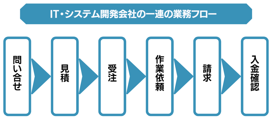 受託開発業務は、受注してから売上を計上するまでのフローが長いという特徴があります。 まず自社に来た問い合わせに対して営業がアクションを起こし、商談を進めながら見積をとり、受注したら作業依頼を行い、最終的に検収をもらう、といった流れです。